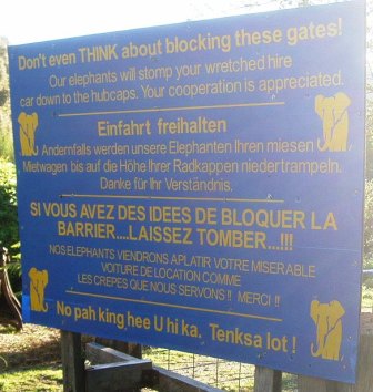 "Our elephants will come to crush your miserable rental car like the crepes that we serve! Thanks."
