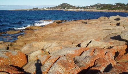 We drove up to Bicheno (along the way our car's fuel gauge stoped working); this was “Tasmania's tidiest town" whose main attraction was the nightly march of the fairy penguins up the beach; since it was still a few hours til dusk, we stopped only long enough to climb on some rocks and empty our garbage bag onto their spotless streets and then moved on.