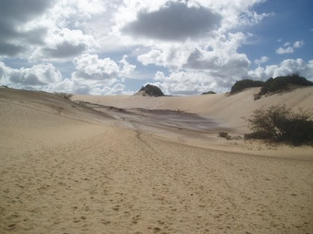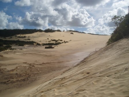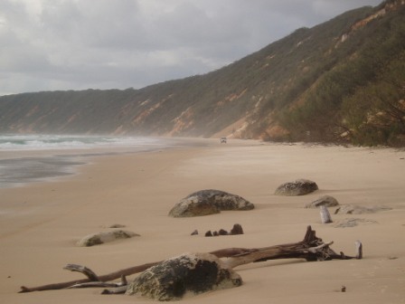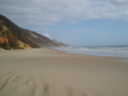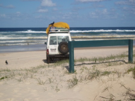 I returned to the hostel just in time for the mandatory pre-trip briefing; here they showed us safety tapes that warned not to feed babies to dingoes or sleep in the middle of the beach/highway. We got to sign a series of forms explaining that despite the $550 we had collectively put into a deductible-reducer, nothing was actually covered, and if any one of the group's 11 members so much as nicked the paint, we'd all be losing our shirts. At the same time, my group filled out an order to the bottle shop for six cases of beer and several boxes of wine – the chances of getting that $200 deposit back weren't looking too great. After the meeting, a hostel worker drove us to the town's giant sand drift and abandoned us there; the promised sunset was behind a cloud, so we snapped a few photos of the sand (can never get enough sand photos!) and hitchhiked home. Strangely, the best deal on food was from our hostel - $4 for all-you-can-eat burritos – in no way did these resemble burritos but after no food for 12 hours and a 35km walk, dogfood would've been a thrill.