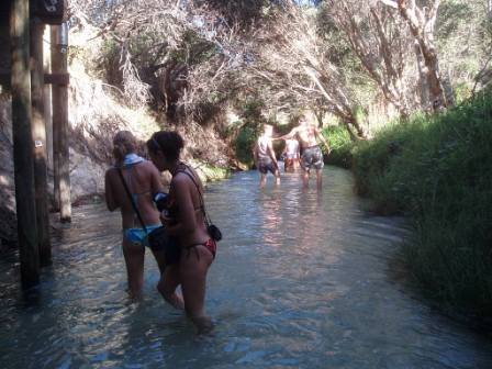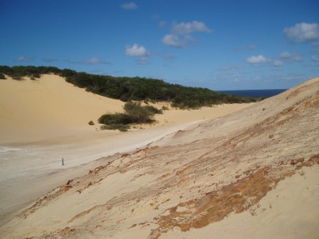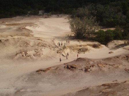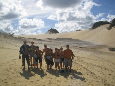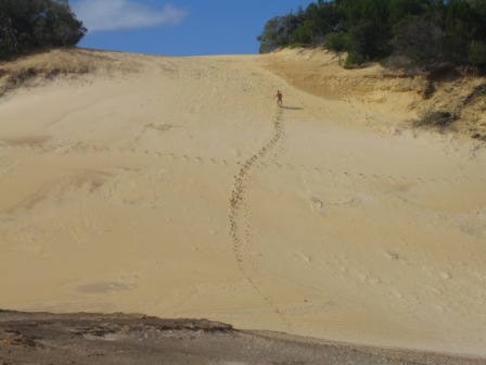 Two hotdogs and an apple later, we walked inland to Lake Wobby; here a high sand dune dropped slowly into a pristine green lake. We all raced down the dune by running, rolling and doing cartwheels. At one point it was decided that we would form a chain of ten by grabbing the ankles of the person before us and simultaneously rolling down; it eludes me how we escaped serious injury with that one.