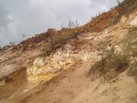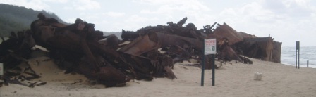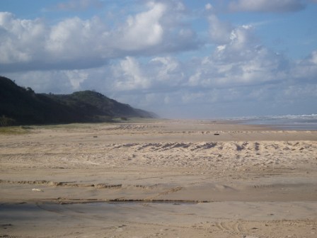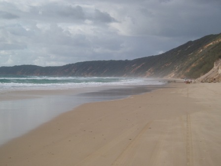 In the morning, I grabbed my free pancake feast and set out on what appeared to be a quick hike down the beach. I measured how long it took me to pass a certain feature on the map and then extrapolated to get an estimate of the full trip – I guessed it would take around 15 minutes. Two hours later, I began to suspect that my tourist map was not entirely to scale (perhaps I should have guessed this earlier from the fact that the cove's sea monster was depicted as being longer than the entire beach). The path was lined with high sand cliffs with an amazing array of colors. 4WDs frequently zipped by at 80 kph along the sand (in retrospect, this would've been a much better approach to the trip). After 11K, I went through a pass to the neighboring TeeWah beach; this lacked any scenery but was stained blue with the carcasses of thousands of man o' wars (these made cool popping sounds when you stepped on them – kind of like bubble wrap). There was an old wreck which didn't resemble much of anything; it was apparently full of asbestos so I had to resist the urge to play on the rusty pile of scrap. 7K on this stretch and the beach was replaced by a subtropical rainforest. Here it would rain just long enough for me to pull out my poncho and stop for just the right interval for me to get hot and pack it away. On this trail I would come across my very first leeches – these nasty little critters crawl inside your socks and suck your feet dry – this really wasn't conducive to walking the remaining 15K.