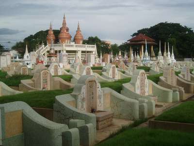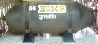 The 80km journey took right around 3 hours; the plan was to rent a motorbike from a dealer that my guidebook claimed to be right next to the bus station. This business had unfortunately shut down several years before and I had to make the long trek across town to the tourist district. It was a dark and stormy night so I couldn't do much in the way of sightseeing, but I did run through a few historic cemeteries (always best on dark, stormy nights), and I breezed through the market where I attempted to order a whole grilled cuttlefish for dinner; unfortunately, the price for one of these turned out to be around 300 baht and probably wasn't intended as a one-person snack, so I settled for the usual 15 baht rice dish. The guesthouses were all lined up along the river on the road to the famous bridge; I paid 3 bucks for a room with a shared bath – the high price was largely due to its location – depending on the night's weather, there was a decent chance I could wake up in the River Kwai.