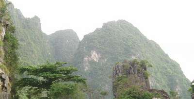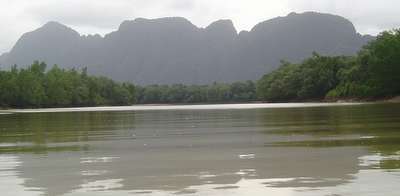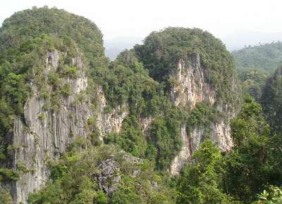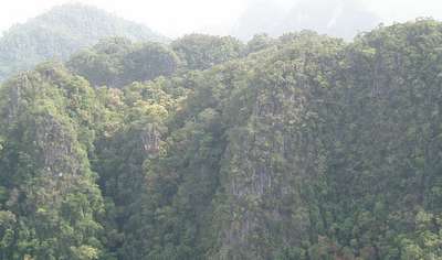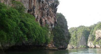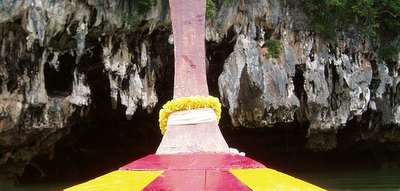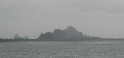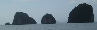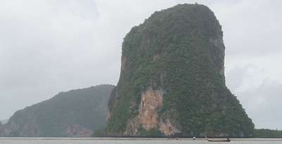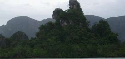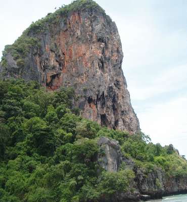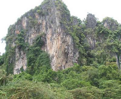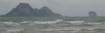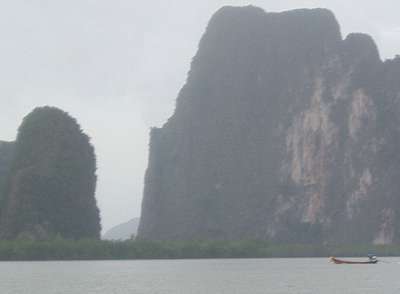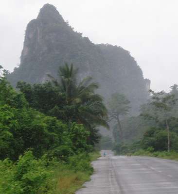 Returning to town I took a boat from Ao Nang Beach out to a group of beaches that were world-famous for their rock climbing. The boat went straight out through the 2-m surf and was adeptly steered over each peak; though as one particularly huge wave crested right before our bow, our fate became clear and all my possessions were instantly soaking wet. We surfed into shore and just barely made it without tipping. There were a number of shops offering half-day rock-climbing trips but slogans such as “all instruction provided" and “fun for all ages from 5-105" deterred me, and I was content to just march through the formations of Diamond Cave and hike through the construction zones of the surrounding beaches. I returned via the “all-weather route" to the other side of the peninsula and grabbed a songtaew back to my bike.