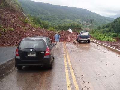 Shortly after the "2 km to Bo Klua" sign, we came upon a rather disheartening sight - a massive landslide had buried the highway under a meter of rock and made it quite impossible for our car to reach our destination which awaited us in plain sight only a few thousand meters away.