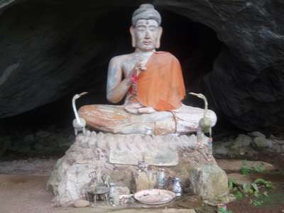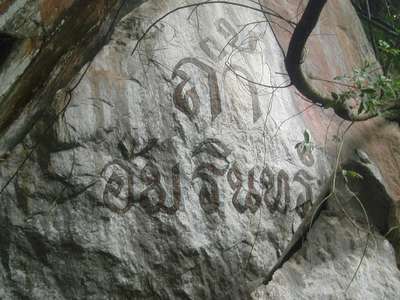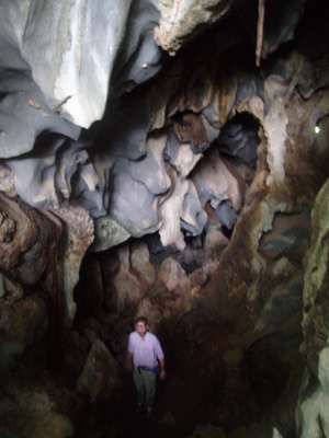 In the morning we followed a cave sign and a few sets of directions to an operational quarry. There were no further signs, but we did find a chunk of rock that looked as if it might have caves. The area was heavily overgrown and we had nearly given up when we sighted a Buddha statue through the trees. Armed with headlamps we crawled back through Amarin Cave where we were nearly lost in a labyrinth of tunnels, dashed upon sharp rocks, and eaten by bats, but in an hour's time, we managed to escape unscathed into the sunlight.