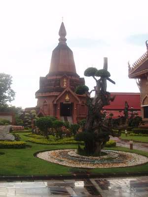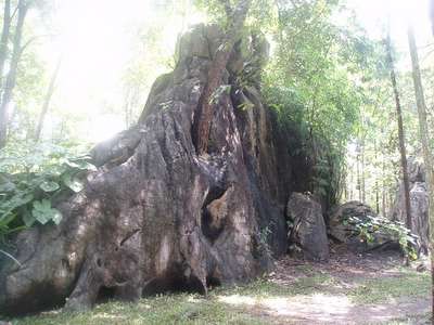 We rocketed down the superhighway (sometimes reaching speeds in excess of 100kph) to the town of Lampang. This is the only place in Thailand where horse-drawn carriages are still used for public transport. Following a few hours of Ben Hurr style races down the city's thoroughfares, we made our to the "most beautiful wat in northern Thailand." We killed 10 minutes or so so there before continuing on to Phrae (did you just think "Fray"? Better go back and look at my speaking guide!) where we found several other old wats, a teak mansion, and various other mildly interesting edifices. Before arriving in the town we happened upon a rock garden which featured giant stones which, given sufficient hallucinagens, resembled elephants, camels and stegasaurii.