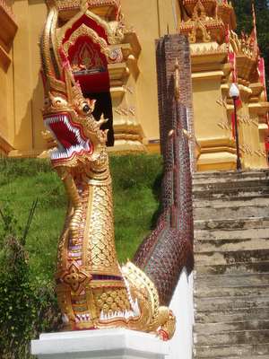 Shortly after returning to the highway, we found another narrow road that ran back through a few villages and paddies to a waterfall of sorts. Further down the road, we entered the town of Dan Sai - here we spotted an odd shape on the top of a hill and followed a few hundred stairs to what was perhaps the most impressive wat in all of Thailand - the outside resembled a European cathedral and every inch of the interior walls was covered with stunningly bright murals.