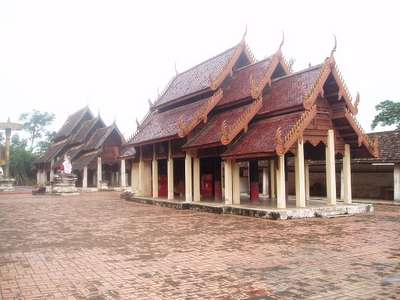 The guidebook recommended a park with huge mushroom-shaped piles of dirt but after driving 20 km out of our way, the signs disappeared and the trail went cold. Further up the road in Nan, there were yet more wats and a provincial museum which actually bothered to put a few exhibit descriptions in semi-decipherable English. We happened upon a restaurant that served up all-you-can-eat vegetarian food for 15 baht - clearly the average Thai vegetarian doesn't down six plates full for his morning meal.
