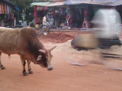 At another temple, large monkeys climbed up the framework; I made the mistake of looking one of these in the eye and he promptly jumped down and chased me off the premises. Cows roam the streets throughout town; they seem a tad bewildered by their lot in life - they just stand around, eat garbage, and occasionally get smacked by angry shopkeepers and motorists - they seem to like markets the best as there are plenty of fruits and vegetables just lying around on the street. Old women go around collecting cow pies (with their bare hands); they mold them into discs and leave them to drive in the sun - I'm not really clear on what happens to them after this - probably sold as some sort of souvenir or snackfood to unsuspecting westerners (update: I'm told these are used to fuel biodiesel-powered rickshaws).