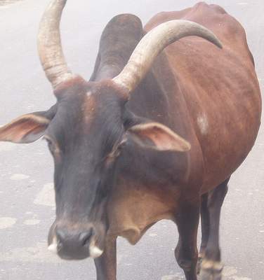 So my first day was wildly unproductive; for the most part I just lay in my room or wandered aimlessly around the city; I ran across a bunch of really cool-looking buildings but never discovered what they were. The navigation situation in Hyderabad is crap - there's not a single street sign anywhere and all the maps are terrible; your best shot of getting anywhere is to ask someone - unfortunately, people in India have the annoying habit of giving completely wrong directions with an aire of perfect confidence - so really, you have to ask about 7 different people who claim to know the place you're going and take the majority opinion. One vaguely interesting thing I came across was the use of something resembling a gnu for transport; they paint their horns red and cruise around town in something similar to an oxcart.