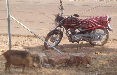 I had followed a tout to my guesthouse, which had a tagline of "We're not in the Lonely Planet"; there also didn't seem to be any signs or any public knowledge of its existence; as a result, when I tried to return to my bed at 11 o'clock, I found myself wandering a number of dark alleys where the only inhabitants were vigilant dogs and wandering cows. Unlike anywhere else I've visited in India, many streets of Pushkar are completely deserted for good chunks of the day, and even if you're running on a parallel alley within a few meters of the main tourist district, you can go for some time without seeing anyone. I did run across a lively party where people banged drums and danced excitedly well into the night; this was a pre-wedding celebration that apparently continued for the next four days; I was invited to join in the dancing, but I have enough trouble with that sort of thing back home and didn't want to attempt something that probably had strong religious foundations; I was certain that my hotel would be immediately adjacent to this raucous event, but I searched for another 45 minutes, narrowly escaping more than a few dog attacks, before running into it.