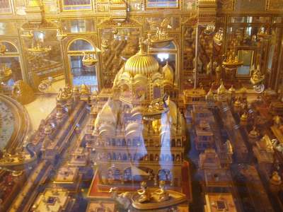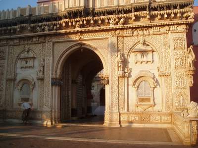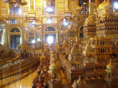Back at the base, I ran up to the bus station and got a seat back to Ajmer. The traffic-clogged streets here came as quite a shock after the silent footpaths of Pushkar, but there were plenty of attractions on offer. In the center of town, a Jain temple featured an immense, 2-story, golden city with all sorts of miniature buildings and vehicles, as well as extremely ornate wall panelings. Down the road was an old fort which housed a government museum with the standard array of sculptures, tapestries and inscriptions (a particularly boring feature consisting entirely of ancient writing on rocks which is inevitably included in every Indian museum); the highlight was a sculpture of a Hindu deity which had a chipmunk living inside - it would make funny noises and shake slightly and was no doubt highly revered by the faithful.