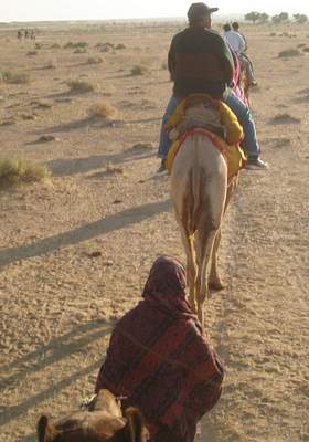Every second where I wasn't frantically touring the town's attractions, I was surveying the options for camel safaris. There was a wide range of lengths and values, from the 50 rupee/day trips where they just sold you drugs the whole time, to the all-inclusive 450 rupee/day trip with extravagant feasts, princely camping arrangements, and all-you-can-drink bottled water. I wussed out and signed up for a half-day trip, which despite its 300 rupee price tag, turned out to be all-exclusive; we drove one kilometre from town to a temple for which we had to pay admission, then proceeded 40km down the road to a national park full of sand dunes where we again incurred an entry fee; there was some question as to whether the camel was included in my "camel safari", but after some negotiations, I got them to waive the 150 rupee surcharge for my hour ride to the sunset point.