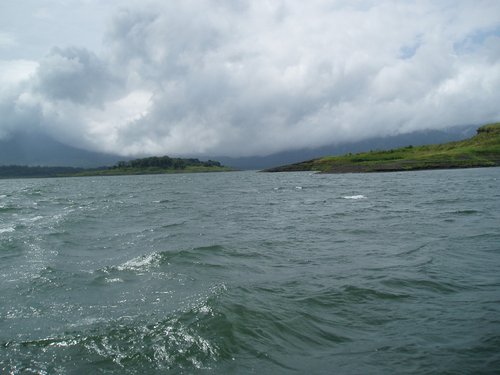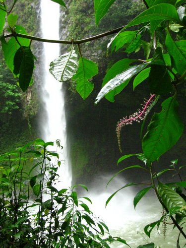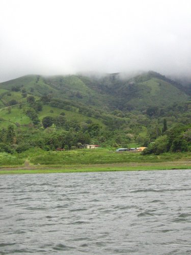 Remembering that we had in fact not been able to lock our door the previous night, we looked around town for another place to stay, but since nothing really compared with our $8/night room, we decided to take our chances with the "thieves". In the morning, we were eventually picked up by a minibus (it was 20 minutes late "because of the rain") and transported down a paved road (in fact the same one we had taken from the park the day before) to the boat dock. This didn't exactly mesh with the romantic images we had formed in our minds of driving a 4WD jeep through the jungle, but it was certainly less bumpy than it could've been. We were herded onto a tour boat with 30 other tourists and ferried across the very scenic Laguna Fortuna. On the other side, we boarded another set of very un-jeep-like minibuses and followed a series of dirt roads the rest of the way to our destination. We stopped for half an hour at a lunch counter which had made some arrangement with the drivers that provided them with unlimited free beer in exchange for unloading tourists there.