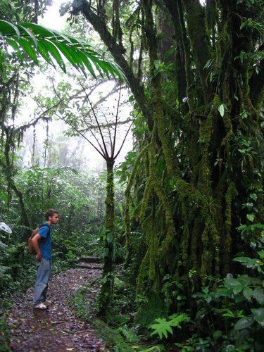 We hiked for about twenty minutes before returning to buy our tickets - the gate keeper was a bit perplexed by our arriving on the wrong side, but did not raise any objections. We paid an exorbitant fare for two breakfast casados with a tourist allotment of toast and jam to accompany the typical beans and eggs. I took one look at the prices of the bottled water and concluded that Costa Rican tap water was now safe for me to drink. We hiked through another 10km of rainforest and spotted what I have decided was one of the exceptionally rare and beautiful quetzals that inhabit that area. At the end of the trail was a viewpoint where, on a clear day, you could supposedly see both the Gulf and Pacific coasts; this was not a clear day. On the southern side of the loop, we spotted a very colorful species of pigeon. Later, we walked through the canopy on a suspension bridge which extended across a small ravine; a sign suggested that only 10 people should occupy this bridge at any one time, so I decided that we should wait and see how many tourists we could get on the thing simultaneously, but this game grew old quick and we were soon hiking the last kilometer to the park exit.