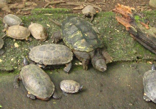 Crawling across Andie's pillow was the first wildlife we observed on our trip - it was a small mollusk that propelled itself by grappling with one of two tentacles that extended out either side of its shell. We flicked this aside and had a few semi-peaceful hours of sleep (not withstanding visits by many varieties of biting insects) before being awoken by the 5am rooster. Stepping outside of our room, I found a small turtle that was in the process of taking a crap on our doorstep; judging from its speed, this creature had spent all morning moving to this spot so that it could present us with this sign of welcome.