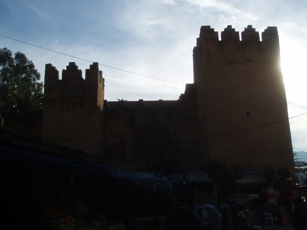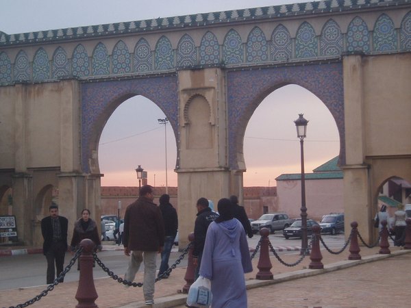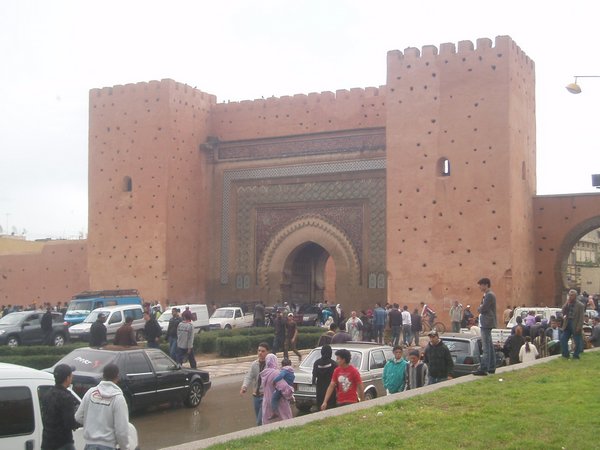 Fed up with getting chased around by "students" (who were "certainly not guides or hustlers but just wanted to practice their English and you could pay them or not, it didn't matter"), I left the old city to try to find the bus station. Somehow my interpretation of the map led me to be perched atop a mud spire overlooking the station a hundred feet below, but a goat path led me down and I was soon on the next bus bound for Meknes.