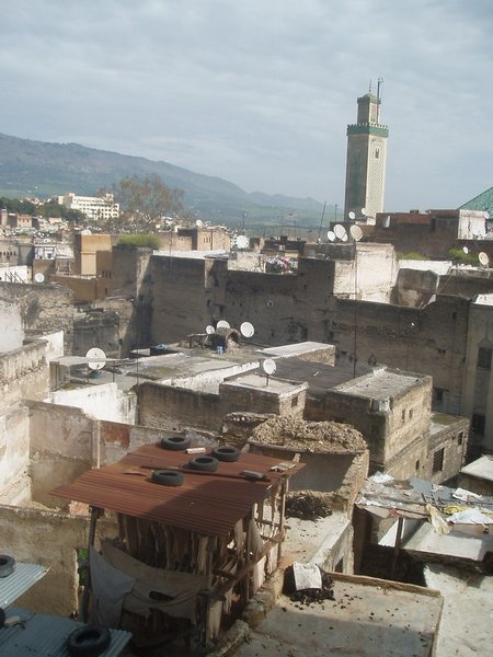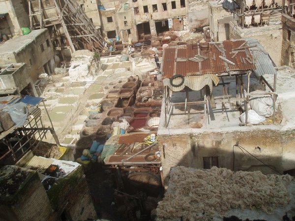 I found a bunch of amazing mosques that I was forbidden to enter (including what was probably the oldest university in the world), along with a number of palatial residences, and antiquity shops with curiosities from throughout the medina's 1200-year history. I eventually conceded to following a tout up to a rooftop to look over the immense tanning operation with dozens of dying pools and thousands of skins; they informed me that pigeon poop was used to prepare the skin after it was delivered from the slaughterhouse.