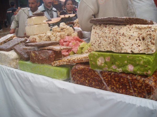 The next edible attraction was the rainbow fudge quarter; I purchased a variety pack of the stuff, but soon found that it all tasted exactly the same and had a flavor very much akin to the smell of toilet bowl cleaner. I'm inclined to believe that the guy had tried to save a buck by replacing all the expensive spices traditionally used with bathroom cleaning products - it's hard to imagine that Moroccans could be so enamored with a food of that sort.