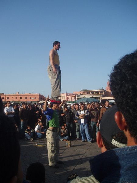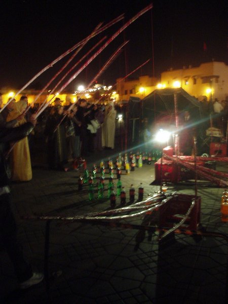 My hotel was all of a hundred meters from the famed Djemaa el Fna, a UNESCO world heritage award recipient for live theatre. It was in full swing when I arrived with hundreds of food stalls, street performers, carnival games, exotic animal shops, and hundreds of locals and tourists drifting from one attraction to the next. I passed up the many sheep head and brain tables (though there were a surprising number of white people patronizing these) and found a stall with a more traditional menu; I had tried most everything in the standard Moroccan repertoire, so I ordered the two remaining options, taglia (which turned out to be several chunks of meat floating in olive oil) and a pastilla (chicken or possibly pigeon, honey, and almonds, with a flaky crust). These were washed down with cinnamon cake and tea at a stand across the way.