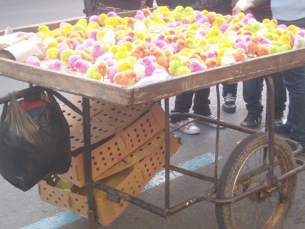 Back in town center, a lively night market was underway. The specialty of this market seemed to be yogurt drinks. There was also someone with a cart of pastel-colored baby chickens, though I never figured out why someone might buy one of these.