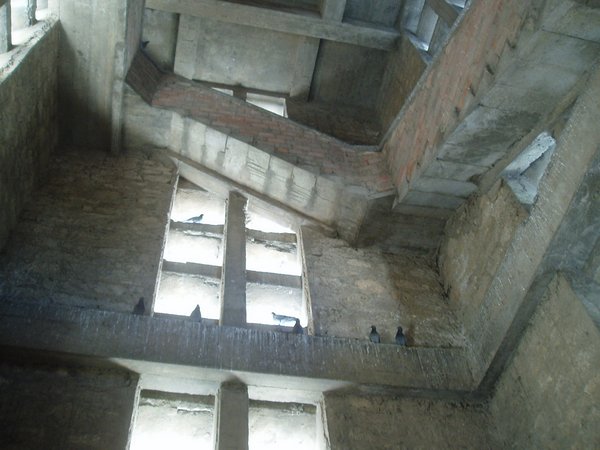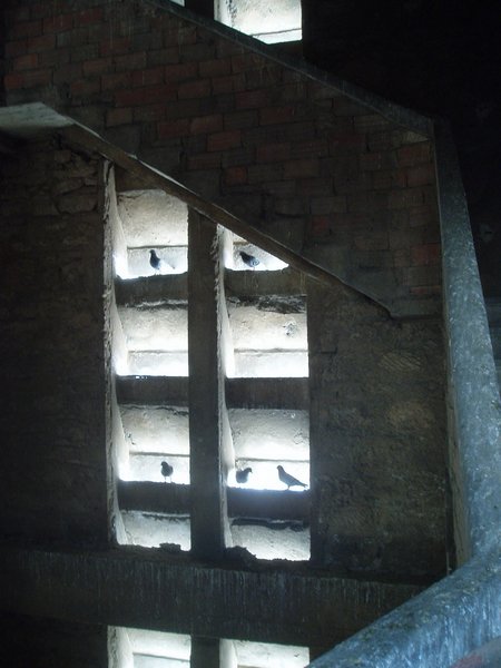 The winding staircase to the top of the tower was covered in feathers, pigeon poop, nests, and eggs; this clearly was no mainstream tourist attraction. A few flights from the top, it was possible to leave the tower and walk the full length of the roof; the opposite tower was just an empty façade, and I lay down in the poop to look over the edge without risking tripping into the abyss. I climbed the rest of the stairs and found the only way to reach the bells was a series of 20 iron rungs, completely covered in crap - I decided the visit had gone on long enough and returned to the ground floor.