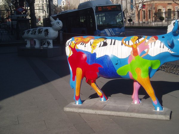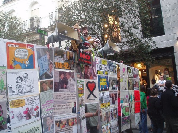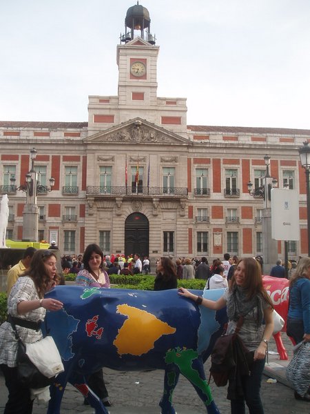 Madrid gets serious kudos because it is one of the few cities in the world that doesn't gouge passengers on transport to and from the airport. You can board the subway or a bus straight from the terminal and go anywhere in the city for a single euro. After three quick train switches, I emerged in Plaza de Callao. Here, there was a protest in progress (against what, I'm not sure, but they had a great drum line) and further down the pedestrian walks radiating from the plaza were human statues, balloon artists dressed as Disney characters, and immigrants selling bootleg DVDs.