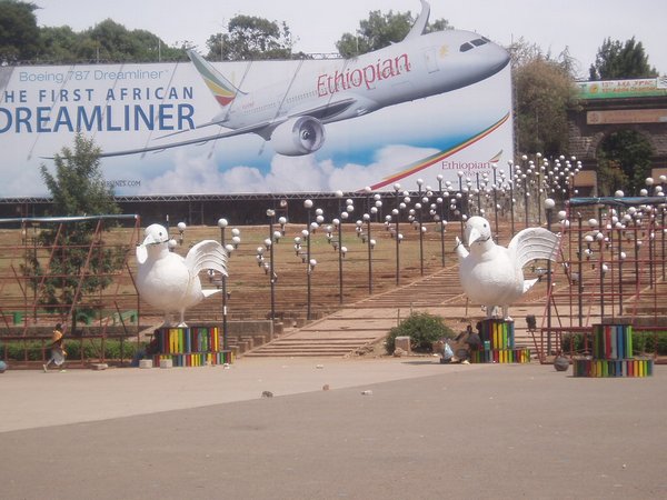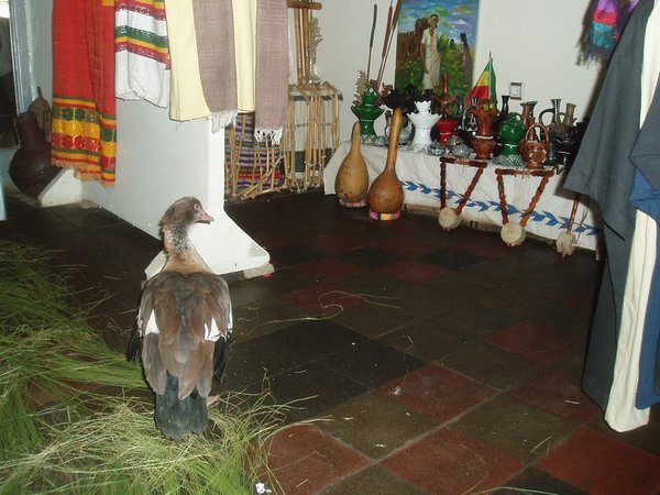 I spent the first day visiting some of the museums that had been closed on my earlier visit to the city. The Ethnology Museum, situated in the center of the extensive campus of Addis Ababa University, offered lots of interesting crafts and paintings. The campus itself had all the trappings and activity of a typical western campus but everything was a good deal grungier. Nearby, the National Museum showcased the bones of Lucy, and had an extensive exhibition on early man and bizarre prehistoric creatures. Just down the street from that was the Natural History Museum which had some pickled animals in jars and an overstuffed leopard. I visited the city's extensive souvenir district and picked up a collection that would for once necessitate that I actually check a bag on my upcoming flight.