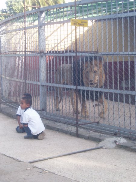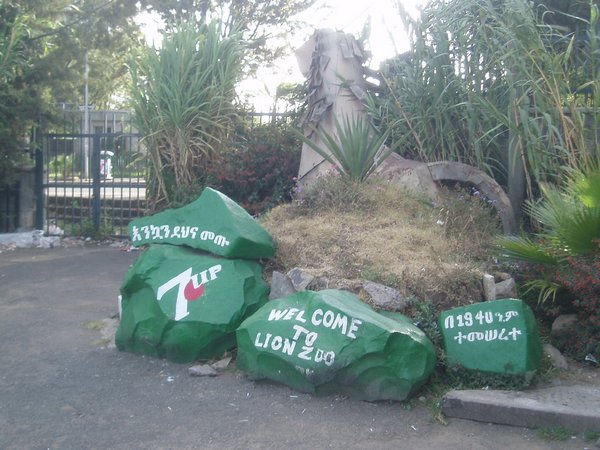All museums and other points of interest were closed for May Day, so I had to rely on the unlisted attractions. Addis is a town made up of a smattering of nearly modern shops and restaurants, interspersed with very colorful and intriguingly designed shanty towns, and arbitrary wandering can be as rewarding as it can be frustrating. I saw a naked woman standing at the edge of a construction lot; I'm assuming she was a prostitute since she was hardly properly attired for construction work. As I walked along a major road near Addis Ababa University, I suddenly heard a loud growl coming from an adjacent street, and thus stumbled upon a true gem; I found the famed Lion Zoo that Haile Selassie had established half a century ago. It was made up of about twenty lions stuffed into a circular cage. General admission got you to a fence recessed about 10ft from the cages, but an extra birr allowed you to walk right up to the bars. One lion stuck its paw through the bars and swiped at a child as her family posed for a picture.
