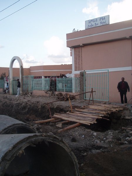 It is generally illegal for buses to run overnight, so all of the longer bus trips simply offload everyone in a town around sundown and take off again at five the next morning. After a fairly excruciating (think three people to a bench seat in a decaying school bus) thirteen hours, we arrived in Dessie and found it to be essentially one big rubble heap. Another huge road project had left it completely incapacitated; makeshift bamboo bridges stretched across construction ditches, and generators powered many of the shops. Most of the hotels were already full when we arrived, so we settled on one with no electricity or running water (and no discount for these limitations).