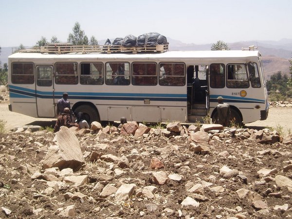 Had I known what awaited me on the day's buses to Gonder, I would certainly have chosen one of the three options for Axum. We left our motel around 4:40 and hiked down the mountain to the bus station. Here we found three buses going to the highway junction at Gashema, but all of them were stuffed to the brim. Perhaps because Lalibela is more remote than most places, the Ethiopian "everyone needs a seat rule" rule did not seem to apply in this case. I was lucky enough to get one cheek's worth of space on the engine housing, but it was still a most uncomfortable 2-hour ride.