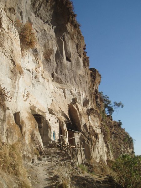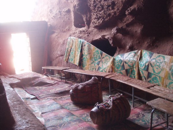 It was no little effort to track down the priest in charge of the place, but we eventually got him to let us in and show us the tapestries. Surrounding the monolithic rock-hewn church, there were a number of small cave dwellings, along with open graves that held some well-preserved mummies.