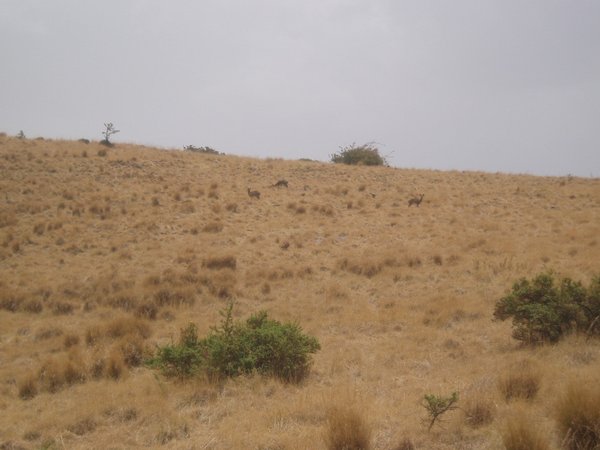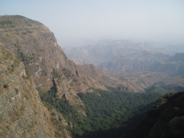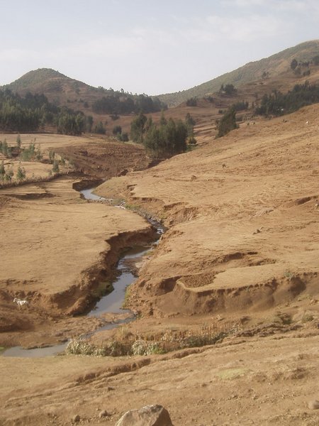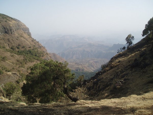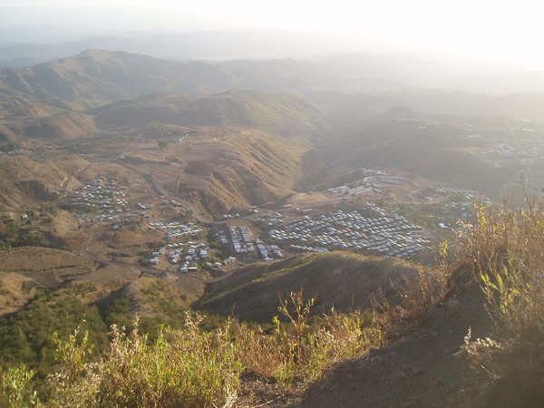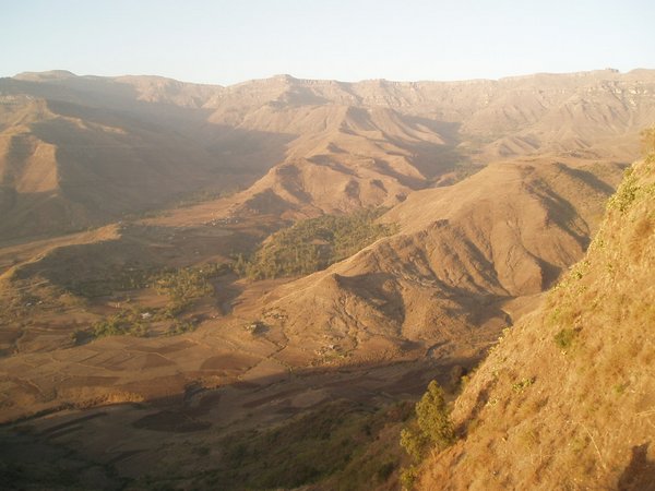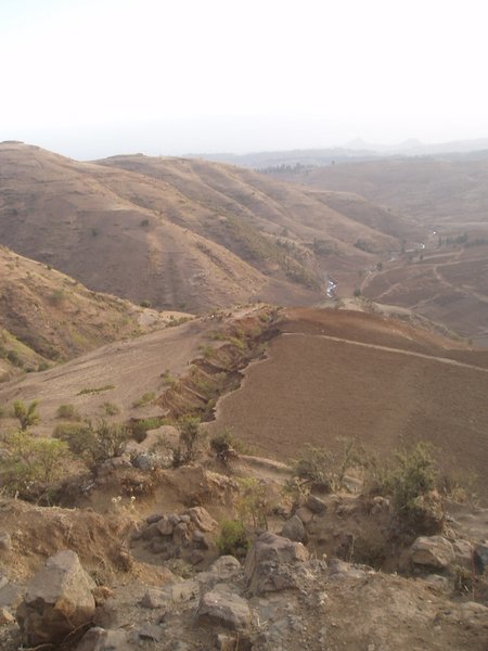We passed along a winding road which followed lush mountainsides and looked down on valleys that were amazingly verdant considering that every single riverbed was bone dry. Villagers hiked towards town with bundles of chat (a mild stimulant which is Ethiopia's second largest export after coffee) and other produce. We arrived in Woldia sooner than expected and stopped for breakfast; I shared a pile of meat and tea with a local teacher and tourist guide.