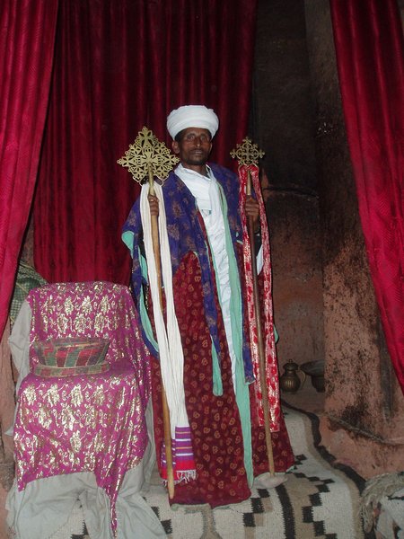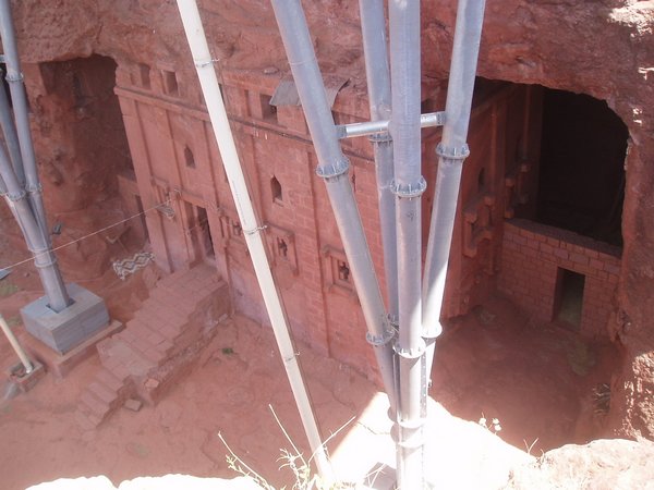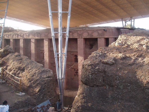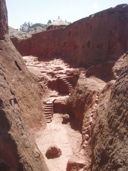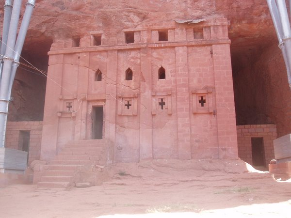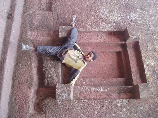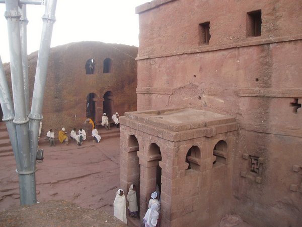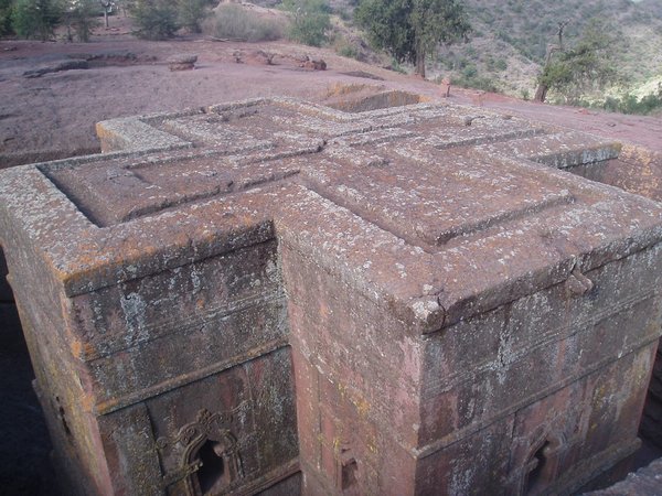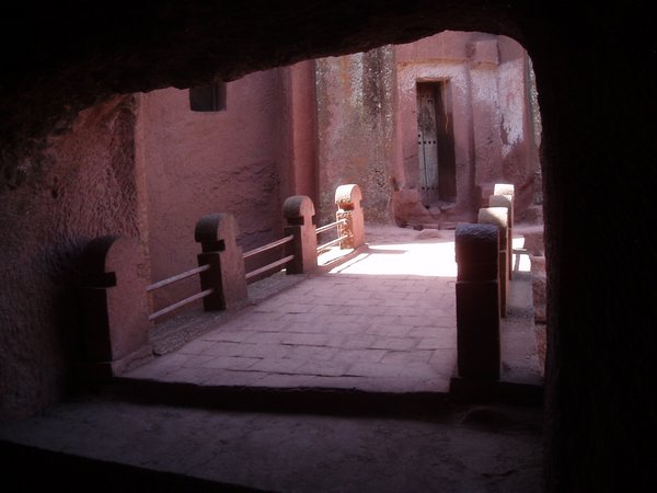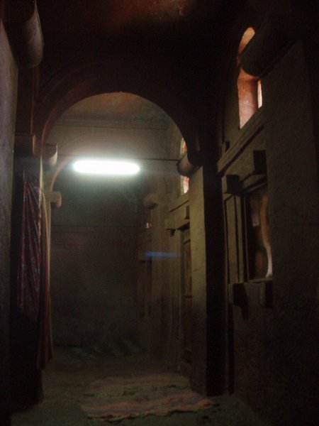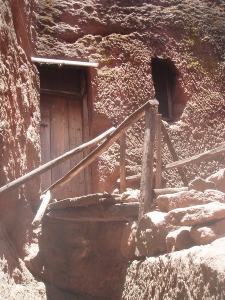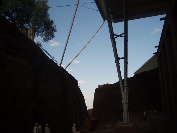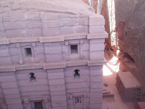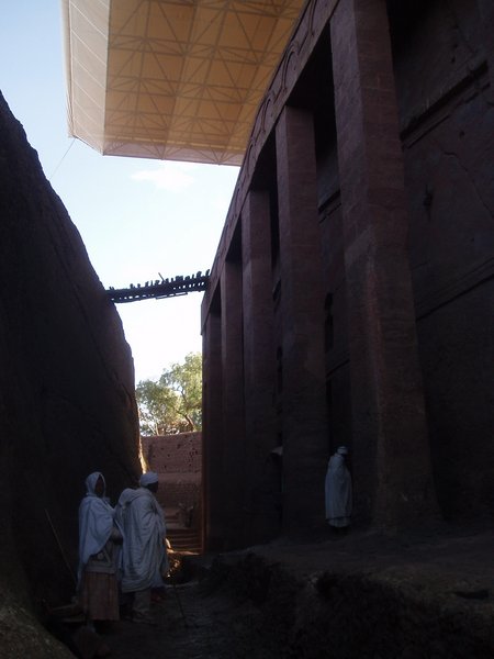 We were accustomed to getting up at 4 and were therefore quite ready to explore the famed rock churches at the crack of dawn. There were no tourists about at this time, only active services, locked doors, and an utter lack of explanatory signs. We soon found that it was quite difficult to see any of the attractions appropriately, despite having parted with a $20 admission fee. We would try to enter a structure or cross a bridge spanning a 20m-deep chasm and someone would yell at us in Amharic and make incomprehensible hand gestures; we eventually gave up on the first group and headed for the most famous of the town's churches, the cross-shaped Bet Giorgis.