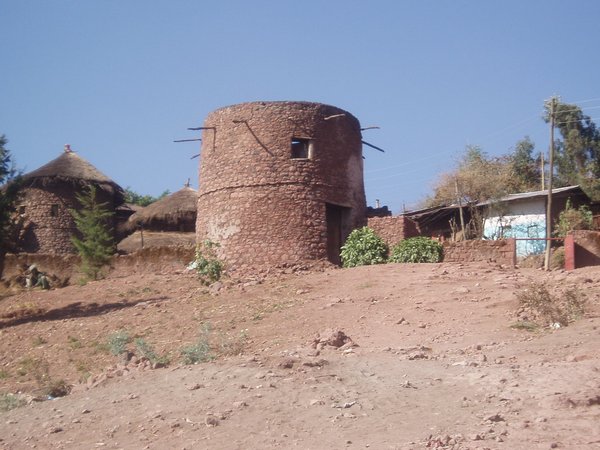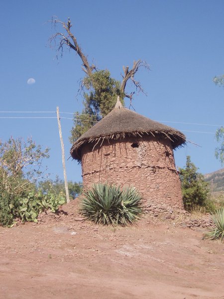 After the second spare had been affixed, we continued along the last few twisty miles to our destination. In one place, we stopped at a village and a horde of rowdy villagers boarded, one armed with a large rifle. The ticket seller had a heated discussion with them for some minutes and they disembarked several hundred meters later. We reached Lalibela around 4 and a tout led myself and the other two foreigners up to the hotel where we had already intended to stay; fortunately for us, he knocked 20 birr off the going rate in his effort to persuade us.