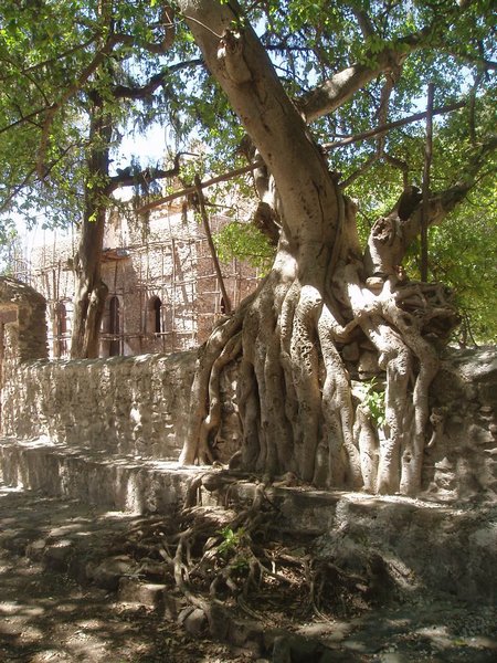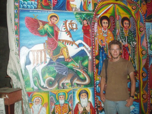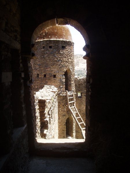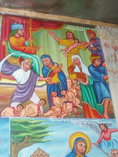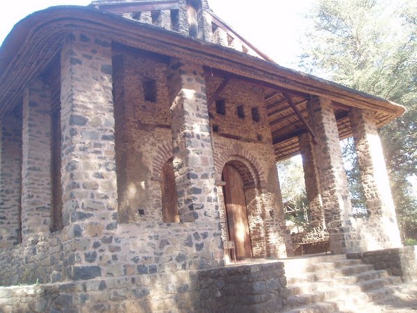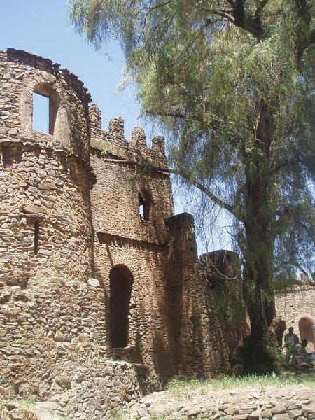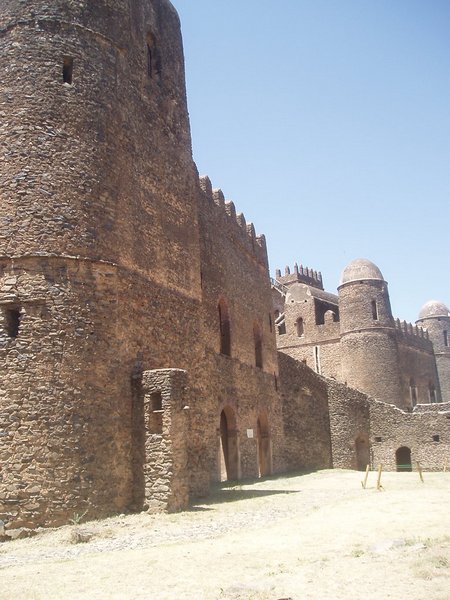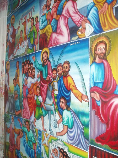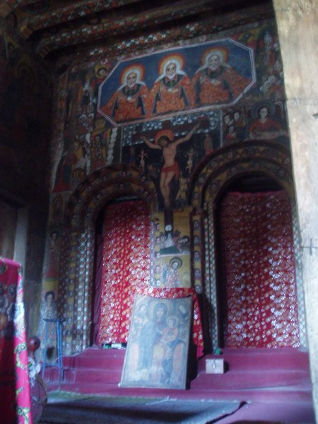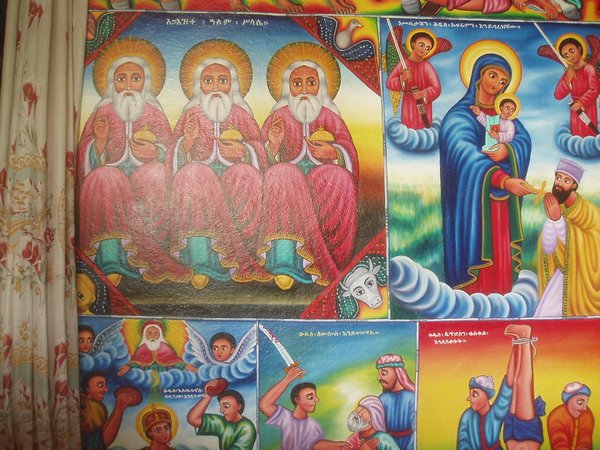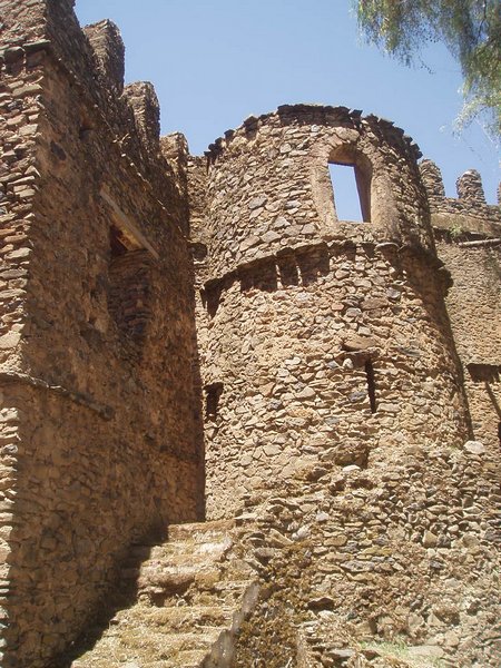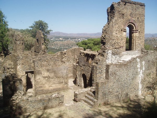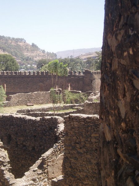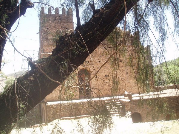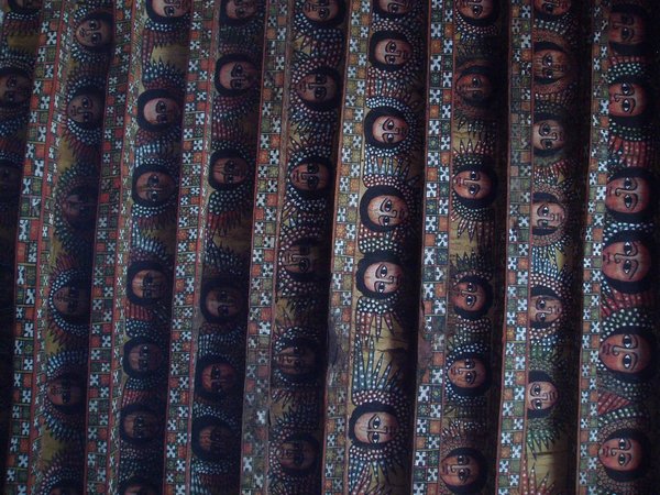 Fasiladas Bath was a bit harder to find; this was one of those instances where the guidebook simply shows an arrow pointing off the map with an estimated distance; presumably it is on you to ask directions and figure out the rest of the route; in this case, a long sequence of such directions led me in a complete loop around the place. The guidebook likened it to Angkor Thom for the trees that grew out of the ancient walls, but besides that aspect, it wasn't overly exciting. Nearby, at the top of a steep mountain, was another castle complex called Kuskuam; even though I showed up smack in the middle of the afternoon opening hours, no one with keys to the place could be found. Clear on the other side of town, Debre Berhan Selassie Church displayed a cool outer façade, as well as an impressive collection of biblical murals inside; I ran into a pair of Englishmen here who had just spent a month traveling around Sudan - they were a rather stoic group, and would only say that "it was different."