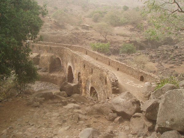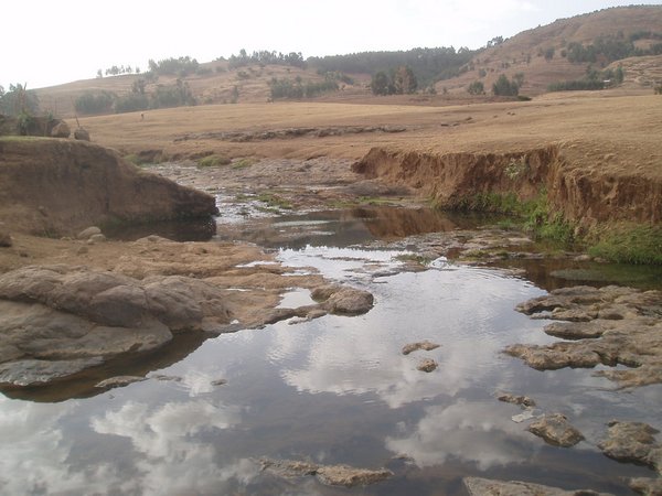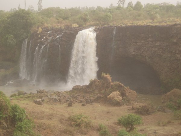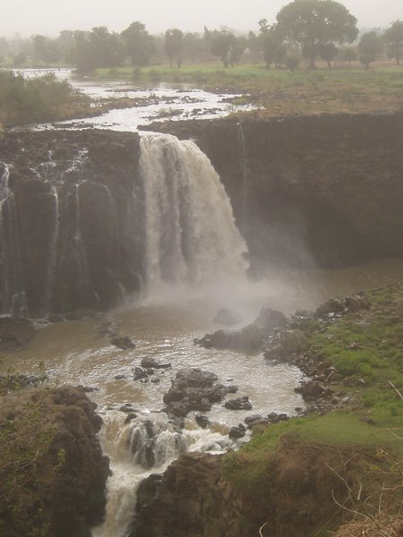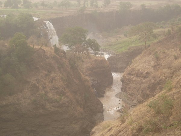 I decided to postpone the boat trip til the next day and head for the famed Blue Nile Falls instead. I went to the bus station and grabbed the tenth unofficial seat on the rickety old bus bound for the tiny village of Tis Isat. I had read in the guidebook that the last bus back left at 3:30, and I would miss that by a wide margin, but the book also mentioned that it was an easy matter to hitch back. However, it soon became apparent that the place was the inconsequential endpoint of a seldom-used road, and I was shortly doing the calculations on what it would take to hike the 32km back to town starting two hours before dusk.