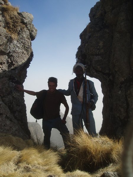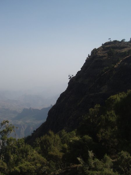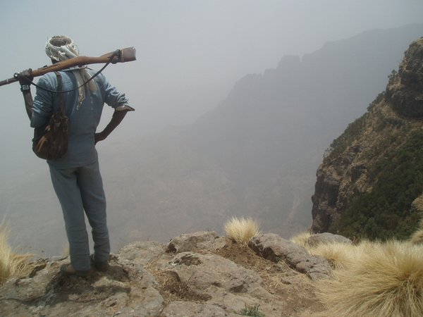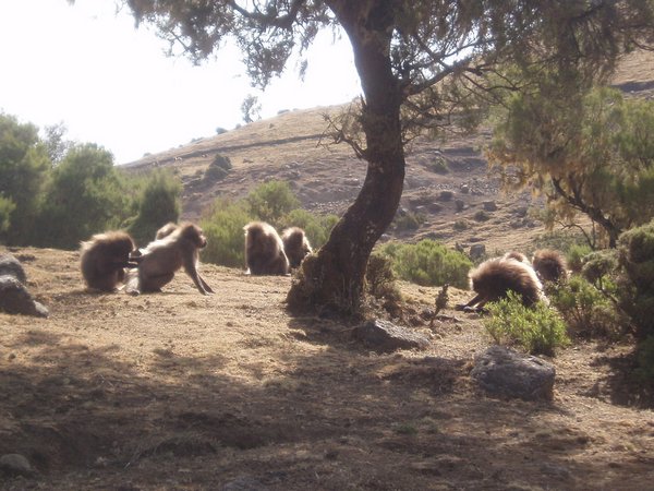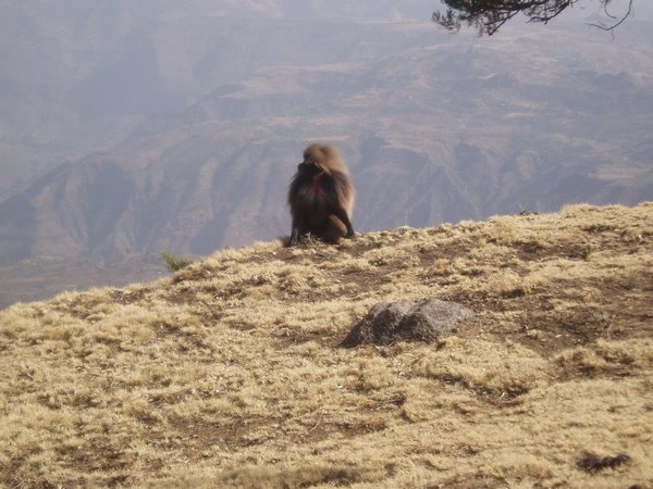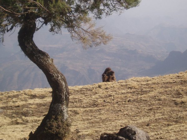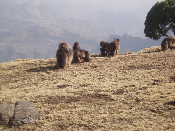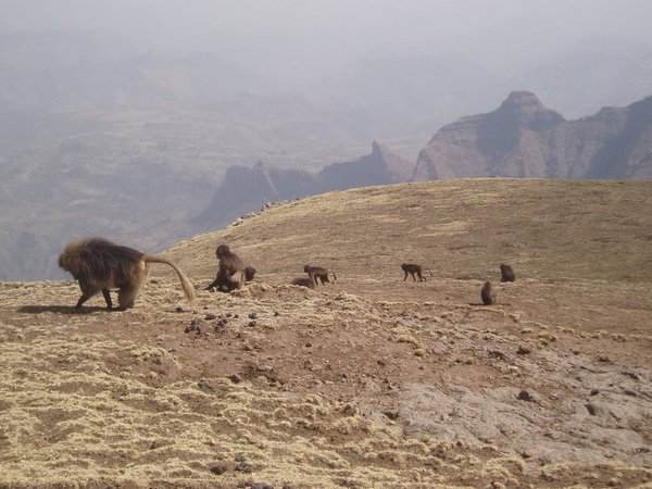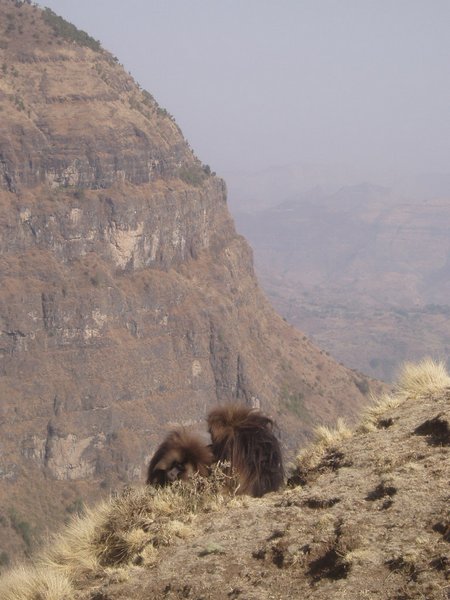 We were up at 6:30, ready to eat the breakfast that was to be prepared for us by that time; unfortunately, the cook had been waiting on us to ask us where to find our oatmeal, and he took another hour to prepare a pot of watery porridge (even though it was the instant variety). After our tea and nourishing gruel, we broke camp (where 'we' mostly implies our hired team) and we started hiking along an incredibly scenic escarpment where cliffs dropped over a kilometer to the lush valley below. Troops of Gelada baboons scurried along the cliff edge, alternatively fighting and grooming each other. It was about a 4-hour hike to the Sankabar Camp where we ate our prepared lunch of cabbage, potato, and carrot sandwiches.
