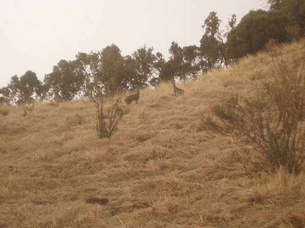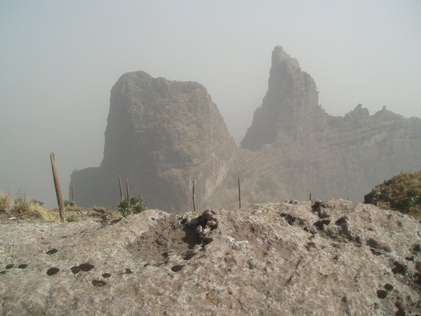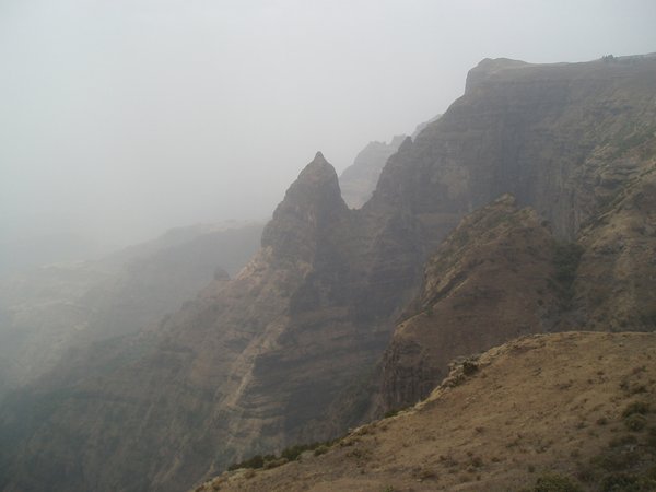 By 7, our cook had prepared scrambled eggs, though the amount seemed a bit short of what our 19 eggs should have provided. We hiked for 2 hours to the seventh highest peak in the range, Imet Gogo, which provided awesome views of the surrounding peaks and features, in spite of the heavy fog. From there, we hiked back to Geech Campground and retraced our steps toward Sankabar. We made it to our campsite by 2:30 and found that our tents were already set up and the tea was prepared. The French cyclists I had met a few days prior, were now coming from the other direction and had set up camp next to ours (though they lacked our extensive staff and had to erect their own tent and prepare their tea themselves). A pair of tourists, most likely American, who wore shorts and neon-green backpacks, walked up, looked around for 20 minutes, and then took a hired 4WD back to Gonder.