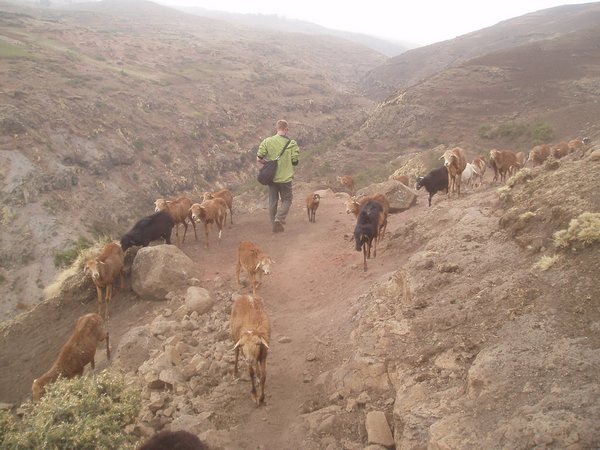 An English teacher from a college prep school sat next to me; he was soon being transferred to a new school some charity had constructed inside the park. I quizzed him on the status of education in the country, and found that there was indeed a need for many new schools, but there was probably an even greater need for new teachers, as well as for a fundamental shift in the priorities and lifestyle of the local peoples. He spent some time lecturing me on Greek drama, the works of Homer, Virgil, and Petrarch, and the legend of Saint George and the Dragon. He also told me that a sheep in the mountains is typically sold for $1-2, and not the $15-20 for which one was offered to us. He cleared up several mysteries of the Ethiopian bus ride, namely that the bus takes so long to move after filling because the ticket seller must debate the correct cost for intermediate destinations with a number of people who would much prefer to ride for free. When we were stopped at a traffic checkpoint for 20 minutes, he explained that the driver was in the process of negotiating a bribe with the cop to avoid a hefty fine for having too many passengers.