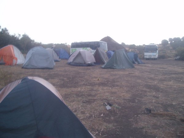 There wasn't a whole lot to do around camp. One of the guys committed the sacrilege of using the camp's cold shower to wash off some of his accumulated grime. We again gathered around the IPod speakers for "This American Life" and awaited the completion of the painfully slow cooking process. Around 5PM, two buses stacked high with mattresses pulled up to the camp and unloaded around 60 college students. Within minutes, a massive tent city was built; two sheep and a goat were brought in for the slaughter, and a massive bonfire was prepared. This was a group of tourism students from Gonder University; one of them wore a Gators sweatshirt, and I let out a rousing "Go Gators" in his direction, but I received no response, and no further attempts were made at communication between the two groups. Luckily they made less noise then we'd expected and the tranquility of the spot was only partially spoiled.
