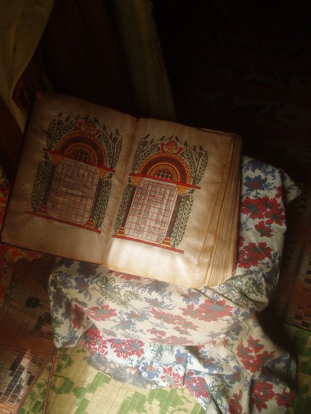 We cruised out into the fog and were soon in the middle of a vast sea with no sight of land on any side. After a time, we arrived at the first island monastery which had many very impressive murals on its internal walls. Moving to a nearby island, we found that its ancient church was closed for renovation (though I still had to pay the $3 admission fee); the exterior, however, was quite impressive and an English-speaking priest showed us a small museum housing a collection of manuscripts and paintings. For some reason, the Ethiopians have always made it a point to print all religious texts on goat skin - one particularly large tome required 161 goats!