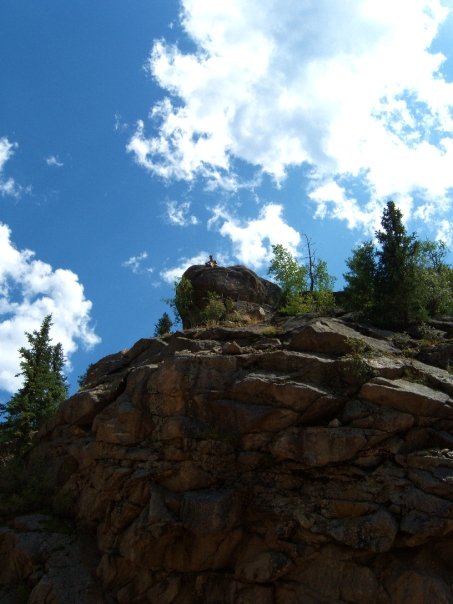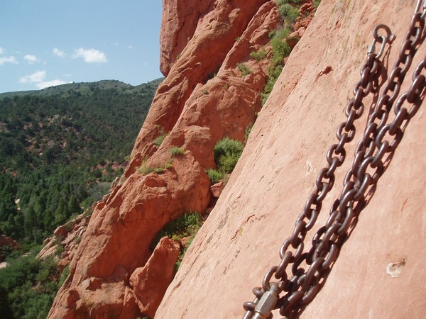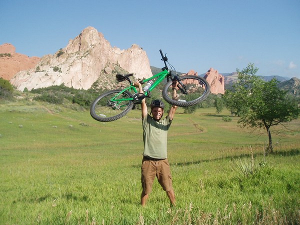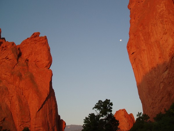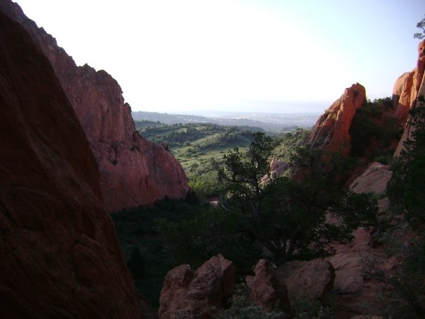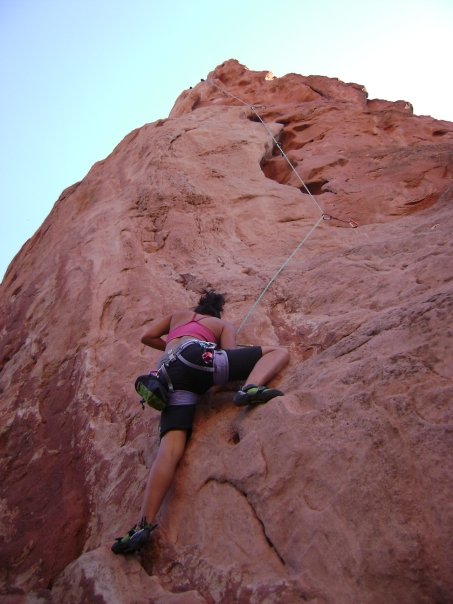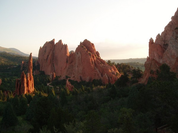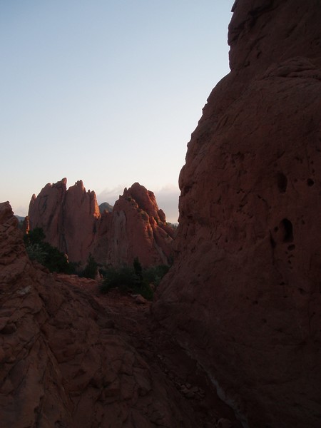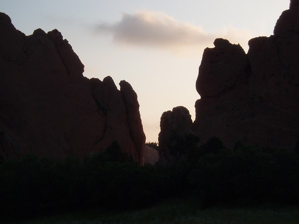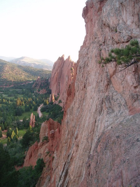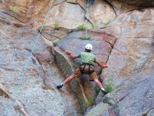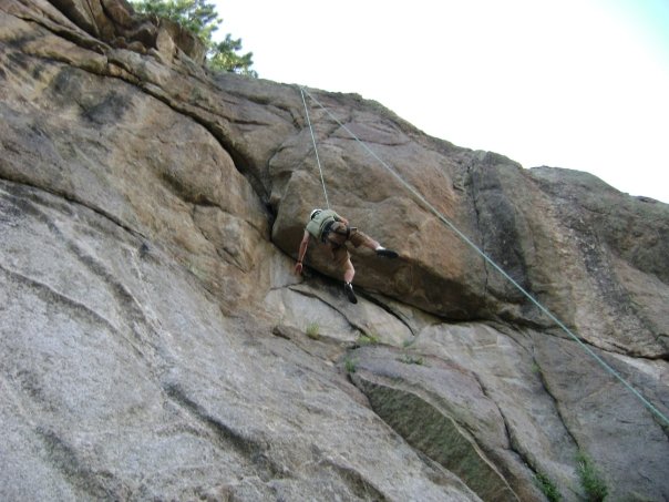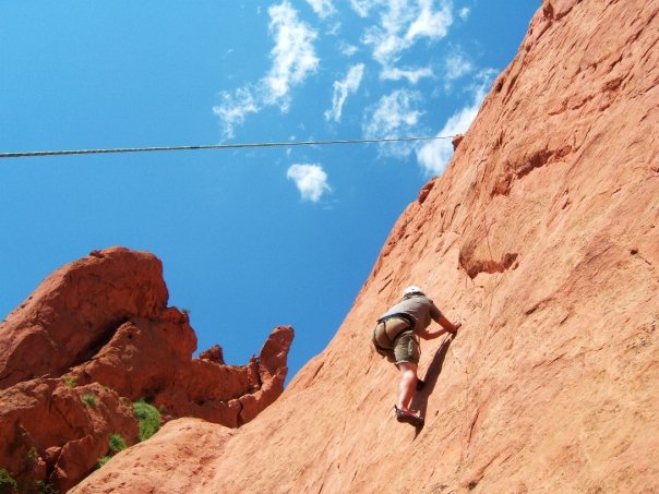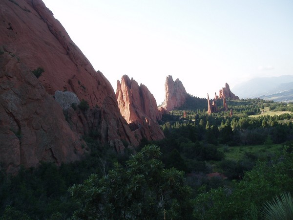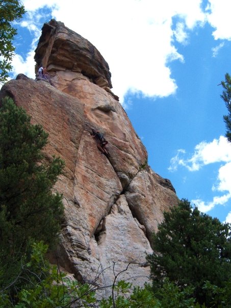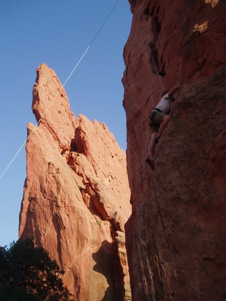 I woke up and drove us to Garden of the Gods at dawn; we were one of the first cars in the lot, and Scott and I got an hour of hiking in on the park's empty trails while the others slept. I spotted no fewer than twenty rabbits hopping around the towering rock formations, as well as deer, chipmunks, and other assorted critters. We biked around the park's scenic, rolling one-way roads and along several challenging MTB trails. The main attraction of the place was the excellent assortment of sport and top-roping routes that ran up the faces of the walls and spires, so after procuring a climbing permit, we set about rigging our rope. The first one we chose was over my head, and after a few hours of trying to lead it (leading = really scary version of climbing necessary for setting up a sport route - you can fall quite far if you pick the wrong time), we convinced a passing expert to set up our rope for us. We spent the remainder of the evening climbing the two spires at the center of the tourist track, which were encircled by a sidewalk and saw several hundred passers-by an hour. Climbing these was a bit like being one of the monkeys on Monkey Island at the zoo; visitors gathered around and pointed and marveled at the mysterious creatures that effortlessly scrambled up the pinnacles; children made funny faces at us to try to elicit some response.