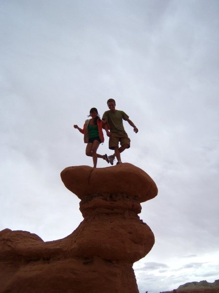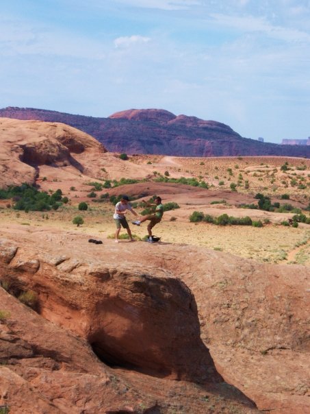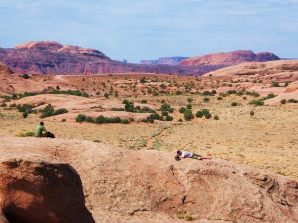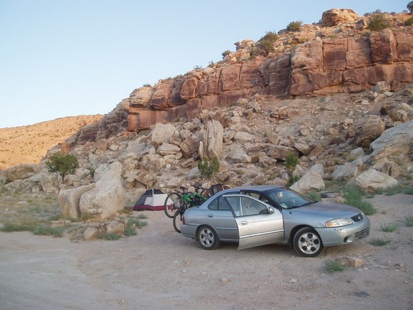 Scott and I rolled into Moab with a few drops of gas to spare; the Sentra turned out to have about half the range of the Corolla, and so we found ourselves repeating this scenario again and again in the remotest reaches of the southwestern deserts. We dropped by the visitors' center to inquire about bike trails, climbing shops, restaurants, and free camping; the lady at the desk, without any prompting, also shared with us a few not-so-subtle hints on where we might find a cheap shower. We got an $8 primitive campsite right next to the famed Slickrock bike trail and watched the sun set over the rolling sandstone as we waited for our friends to arrive. While we waited, a family of unicyclists attempted to ride the trail, which is considered a formidable challenge even for experienced mountain bikers, and didn't seem to be making it anywhere very fast; this seemed like one of the more sadistic family activities a dad could subject his kids to. Van had inconveniently called us just moments before her phone died, and so we spent a few tense hours trying to contact her and Andrew via phone, walkie talkies, and smoke signals, but they fortunately showed up with an hour to spare til the panic time.