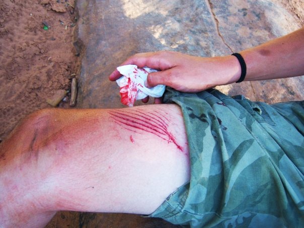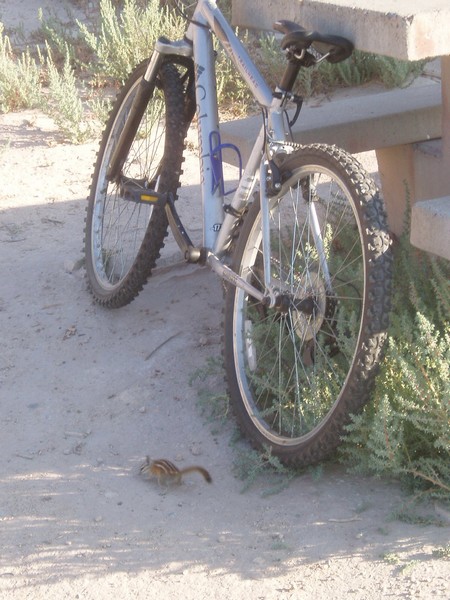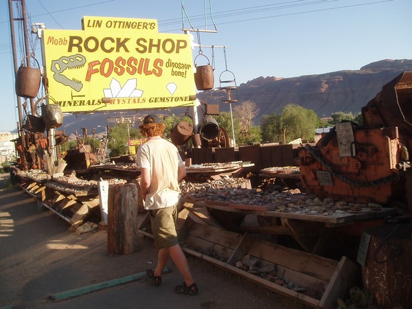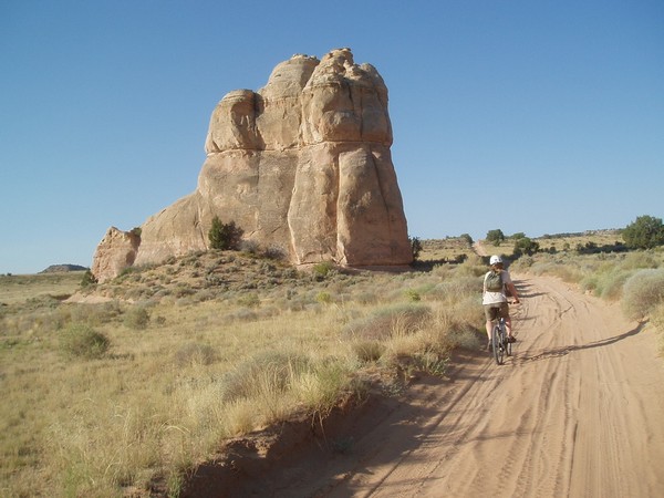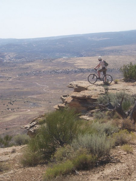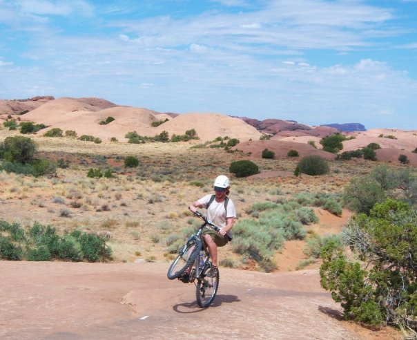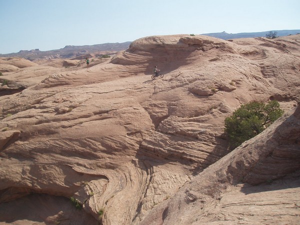 Scott and I woke up shortly after dawn to ride the 12-mile Slickrock Trail. This route, which consists of a dashed line spray-painted on smooth, rolling rock, proved far more difficult than we had hoped, and we ended up throwing in the towel shortly after completing the 2.3 mile practice loop (and depleting our collective 4 liters of water). Van and Andrew conveniently pulled up at the exact instant we returned to the road, and they were all too happy to drive us to the top of an 8-mile section of downhill that they held to be just about the best biking anywhere. We spent thirty minutes flying between sandstone faces and past gravity-defying spires before ending back at Slickrock. We watched some nut on a motorized bicycle effortlessly cruise around rock formations that we could barely negotiate on hands and knees, and then went into town for lunch.