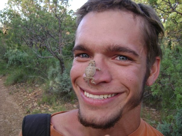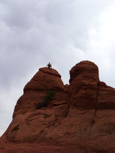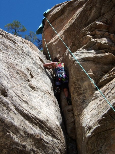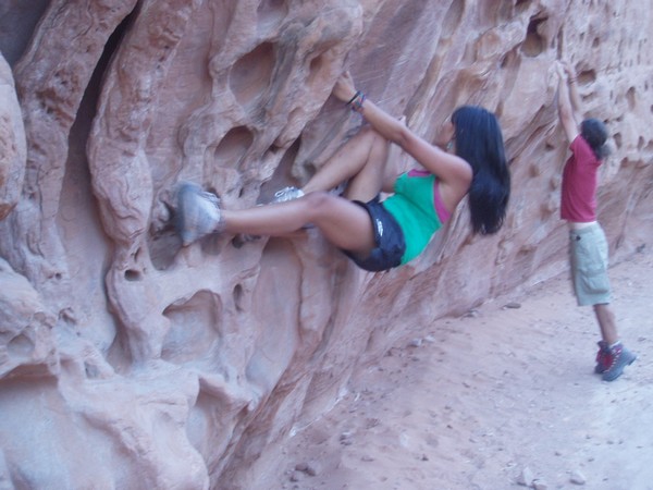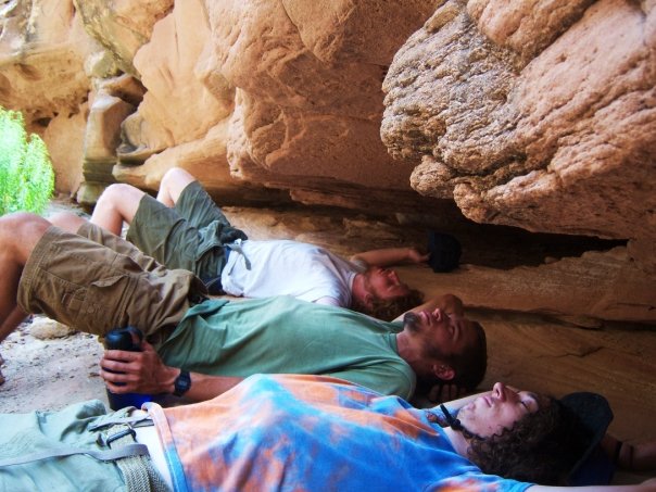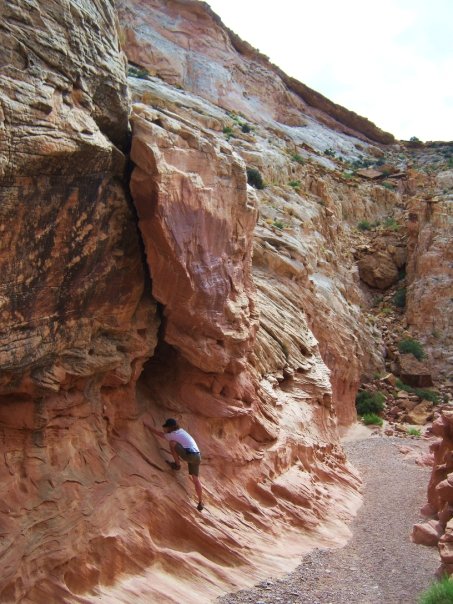 Retracing our steps, we eventually found the way to the canyon and, at the gate, were given a listing of dozens of climbing areas available in the park. We drove to the far end of the canyon looking for these sites, but though we spotted tons of amazing rocks, we had no means of relating these to the names on the paper, and thus no way to track down the limited collection of established routes. We ended up scrambling to some high points and swimming in some small waterfalls, and were on our way out when Scott discovered the first of the gear; we were able to tie our rope into chains at the tops of several walls and spent the few remaining daylight hours rappelling and climbing the 50ft cliffs on the banks of the river. We rounded out the evening by driving about five more hours to the delightfully scenic, primitive, and, most importantly, free Rabbit Valley campground just a few miles short of the Utah border.