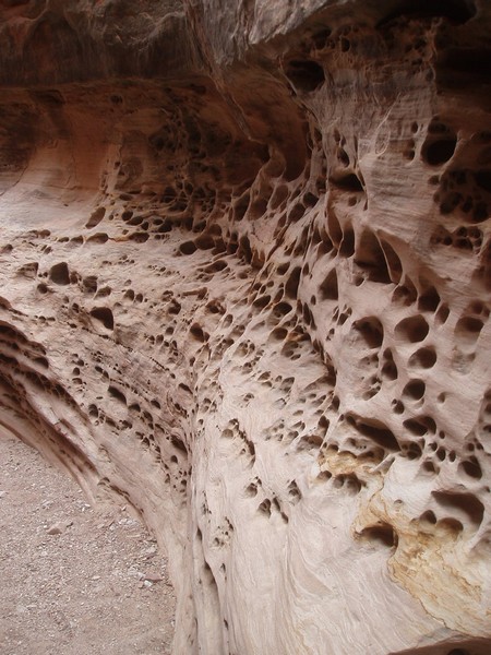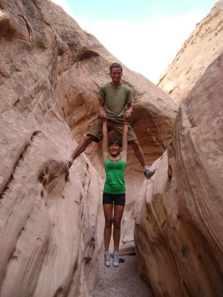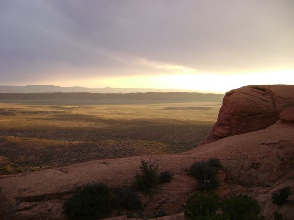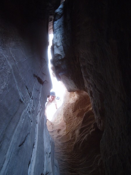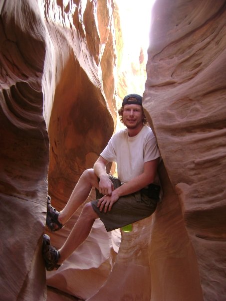 Canyoneering in Utah's slot canyons was another central focus of the trip that was compressed into one day due to weather and climbing. What was left of the original slate was an 8-mile loop through Little Wild Horse and Bell canyons. The trail started with massive walls divided by a wide channel of gravel and sand; this was quite exhausting to trudge through but was soon replaced by a narrow, winding slot that allowed for plenty of fun chimneying, scrambling, and all manner of acrobatics. After an hour or two of this, we returned to another wide channel. What we would soon discover was that we really hadn't covered that much ground while in the slots, and that hiking on sand through the open desert, even if it's only for a few miles, can be atrociously difficult and dangerous. Around the halfway point, Scott became convinced that he was dying of heatstroke and malnutrition and could likely go no further; this was rather inconvenient at the time because the thunderstorm that was fast approaching us could easily spell disaster as we returned through the narrows of Bell Canyon. We saw to it that he was properly fed and watered, and quickly pushed on through the rest of the trail, returning to the car before the first drops fell.