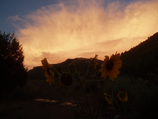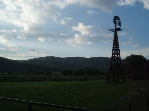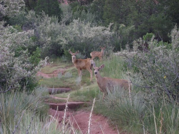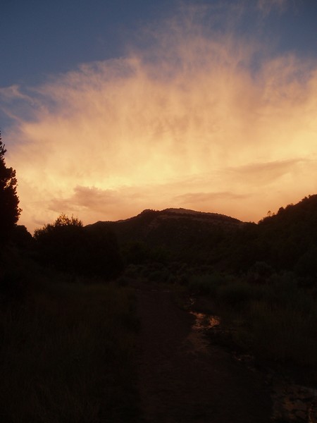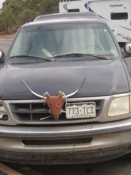 We left the park around dusk, glimpsing a pair of far-off mountain sheep on the way out, and went in search of cheap camping. Van was quite insistent on finding a shower, while the rest of us were content to let ourselves ripen for a few more days and find a stream or lake when it was convenient. After an hour of driving, Andrew and I were perfectly willing to pay our part of $24 for an in-town site with full facilities, but Scott nixed this idea and we headed far out into the depths of the Black Forest where we ended up paying $17 for pit toilets.