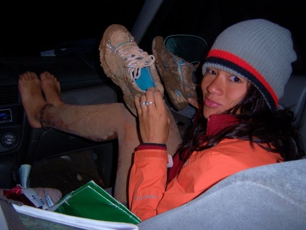 We got a call from Van shortly after we arrived; the two were soaked and freezing and could no longer ride or even push their bikes on account of the deep, impassable mud that had suddenly consumed all trails in the park. We grabbed headlamps, handfuls of snack bars, and all the warm clothes we could find, and started walking up the mountain to where we believed they might be able to meet us. Half an hour passed and we had still seen no sign of them; our cell phone had lost signal and the few maps we had seen suggested that there was no easy way for them to get to where we were. We started jogging back towards the car in search of a phone signal, and only stopped when we spied a light on a distant hillside. We called out, and much to our relief, heard their shouts in reply. Calling them on the cell, we discovered that they had now given up walking and were curled together for warmth. Switching over to a side trail, we met up with them (they were now walking briskly, sans bikes) within 5 minutes. Scott immediately switched into hero mode, force-fed Van two granola bars, and dragged her the remaining half mile to the car. This left me and the healthy-though-somewhat-exhausted Andrew to carry the mud-encrusted bikes back down the mountain.
