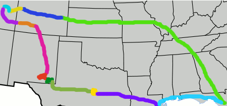 The group had been clamoring for a sandboarding stop since the start of the trip, but for one reason or another, we had not yet managed to stop at any of the dunes en route. So when they became privy to the fact that our route passed within fifty miles of Monahans Sandhills State Park, a stop there became a foregone conclusion – even if we would be arriving several hours after the park's closing time. We stopped at Walmart to pick up some cardboard boxes (I knew from past experience that these didn't work at all, but they were a good alternative to spending money on something we'd be throwing away a few hours later). It was not entirely straight-forward to locate the dunes in the dark, but we eventually found some and spent an hour rolling, running, and flipping (though never sliding) down their heights. Scott and Andrew very much wanted to camp at the dunes, and I, alternatively, very much wanted to avoid spending another day driving through Texas, so Van and I took turns driving through the night, while the other two defiantly passed out in the backseat.